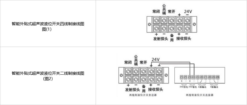 選擇安裝位置、清理罐璧油漆污垢、將專用的粘接劑少許涂抹在安裝底座、按照預(yù)定的位置安裝底座。待底座安裝完畢后,風(fēng)干后將探頭傳感器涂抹耦合劑安裝于底座上。將兩個(gè)探頭傳感器的連接線通過(guò)防爆軟管和鍍鋅管接入液位開關(guān)變送器中,按照接線端示意圖接線。